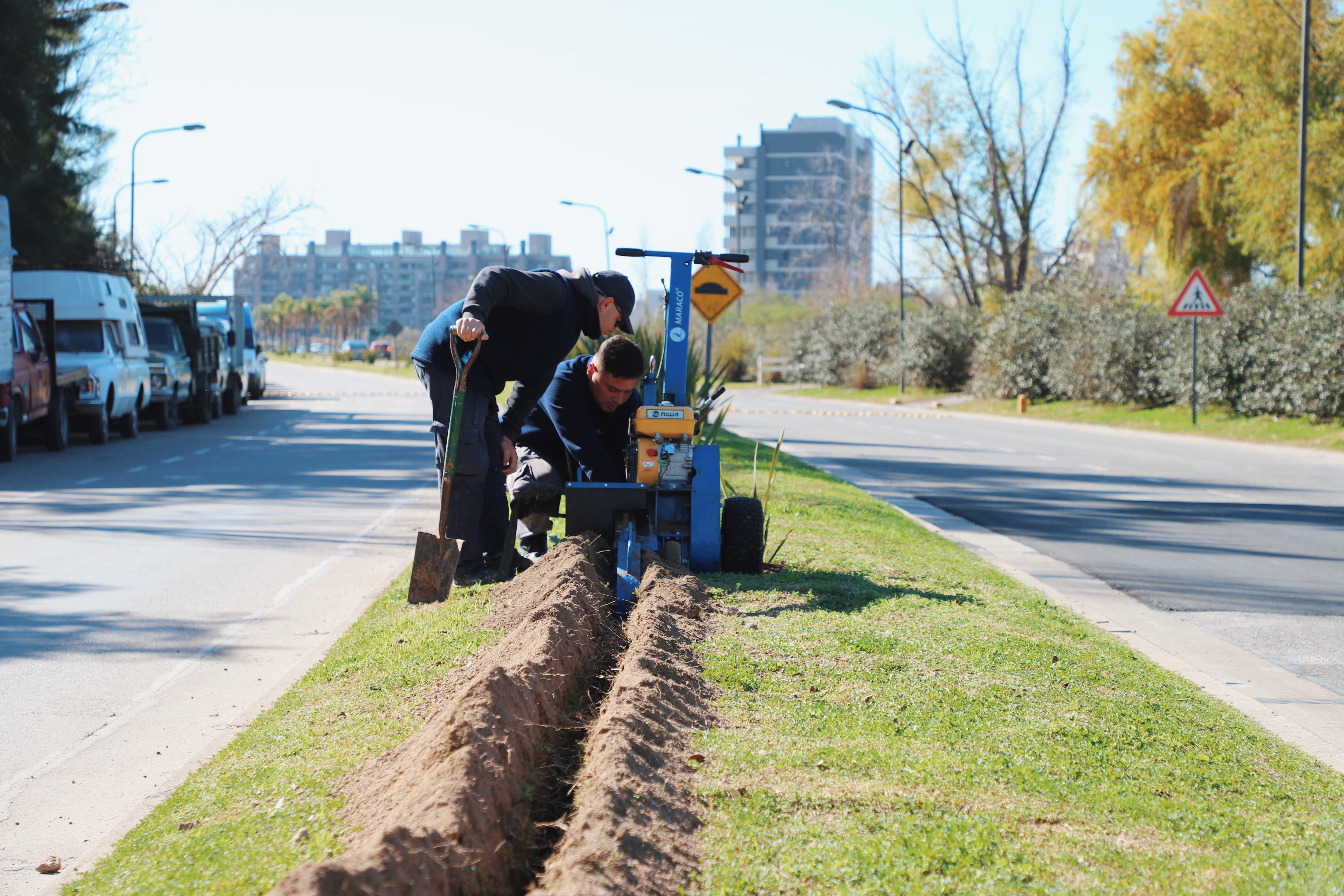 La obra incluye dos momentos. En el primero de ellos, se realizaron túneles y cruces de calles, con la instalación de tendido de red de agua de riego y el sistema de acoples rápidos. Esta tarea descartó el sistema de goteo previo, y colocó tomas de riego para acoples de mangueras a demanda.